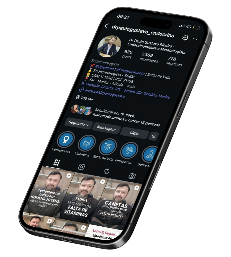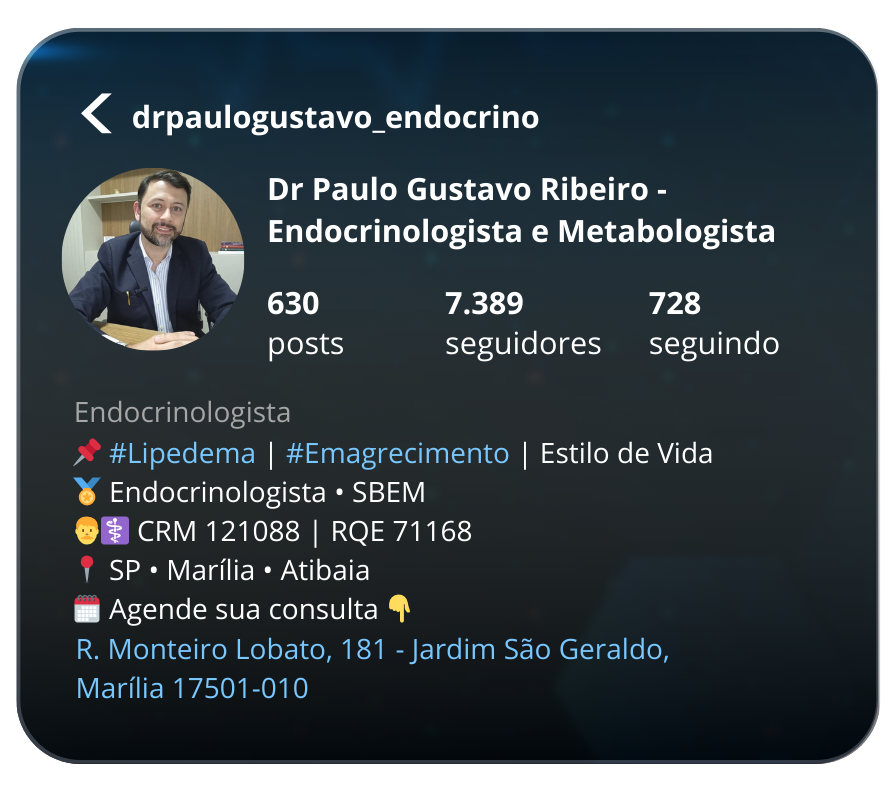 Dr. Paulo Gustavo Ribeiro é médico endocrinologista e metabologista, possui o título de especialista pela Sociedade Brasileira de Endocrinologia e Metabologia desde 2011, possui ampla experiência nas diversas doenças endocrinológicas e metabólicas, como, lipedema, diabetes, obesidade, disfunções da glândula tireoide, reposição hormonal na menopausa, doenças neuroendócrinas, entre outros.